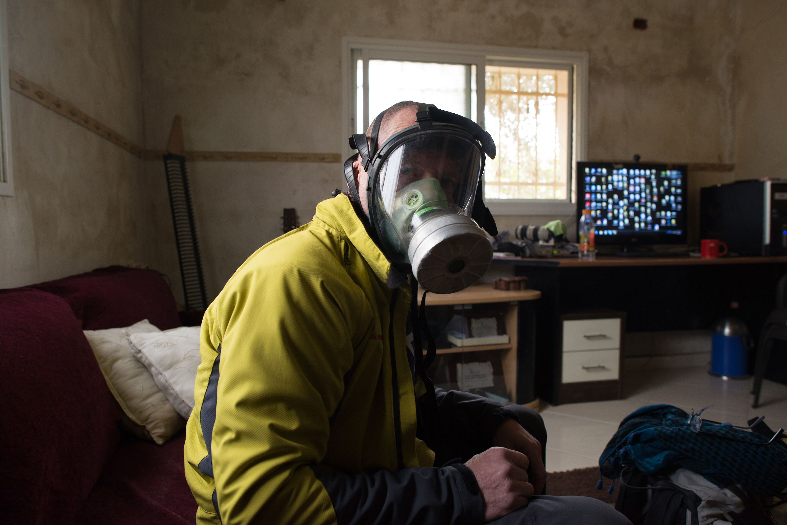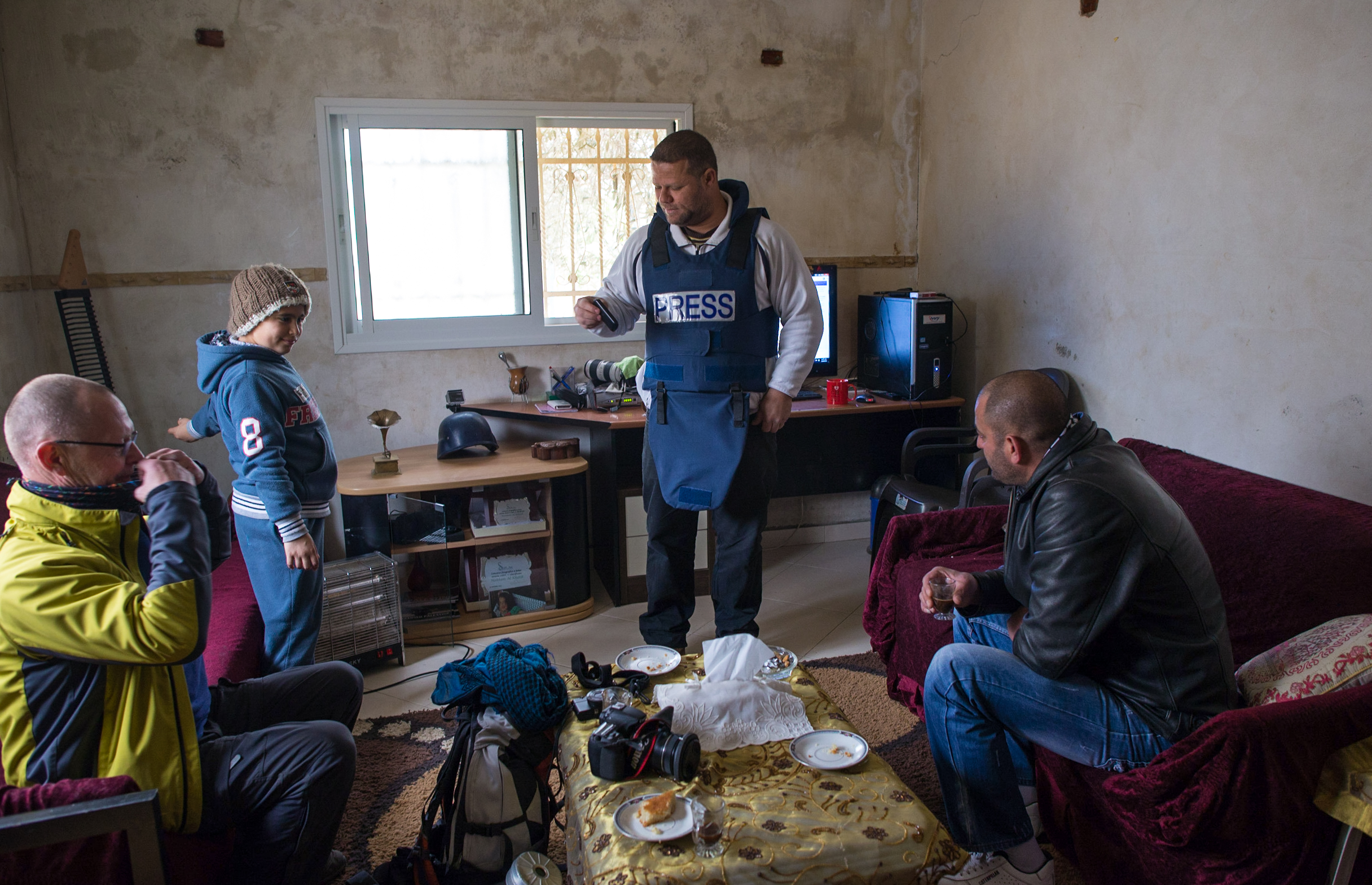 Haitham is a photojournalist living in Bil’in near Ramallah, where weekly protests by the local people, internationals and Israeli citizens (peace activists) takes place every Friday. He prepares himself for the demonstrations by putting on a bullet proof vest, a metal helmet with a camera on top, and a face mask to avert the tear gas. He is also the author of the book on the coffee table entitled “Occupied Palestine”.
